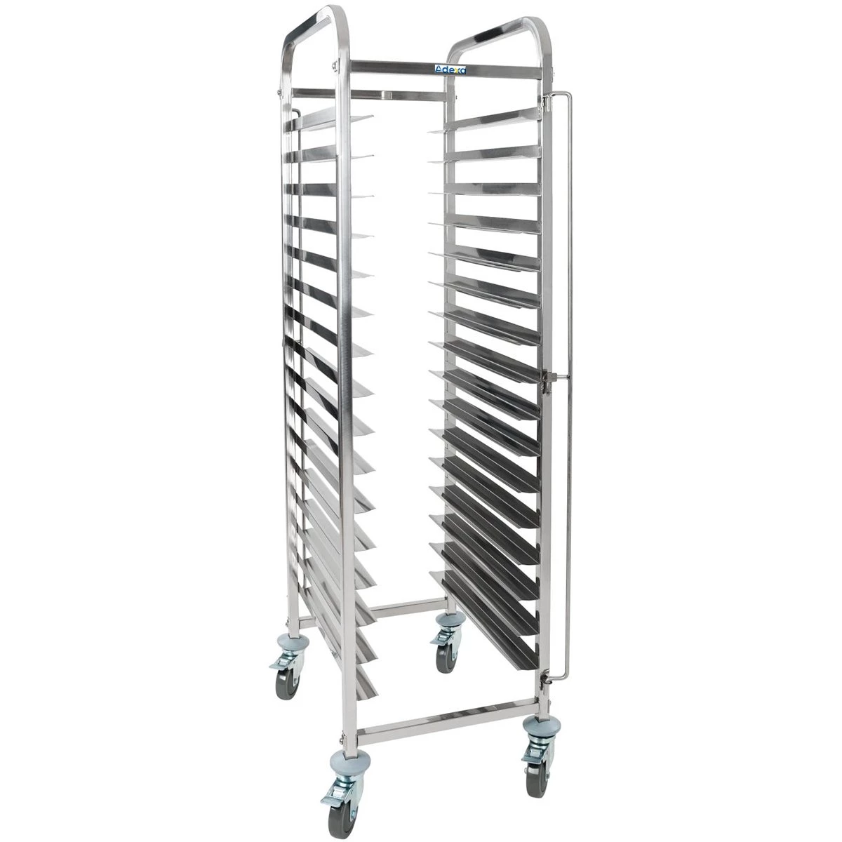 This high quality professional racking trolley is ideal for stacking and storing large numbers of commercial gastronorm trays or pans. It’s 15 tiers are mounted on four castors for ease of movement within your restaurant, bakery or similar catering establishment.