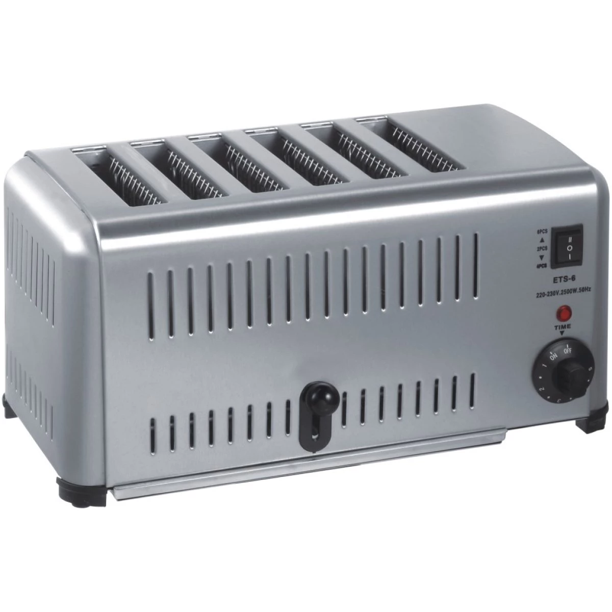 Commercial toaster with 6 slots to accommodate 6 slices at one time. For professional catering use in restaurants, hotels and cafés.