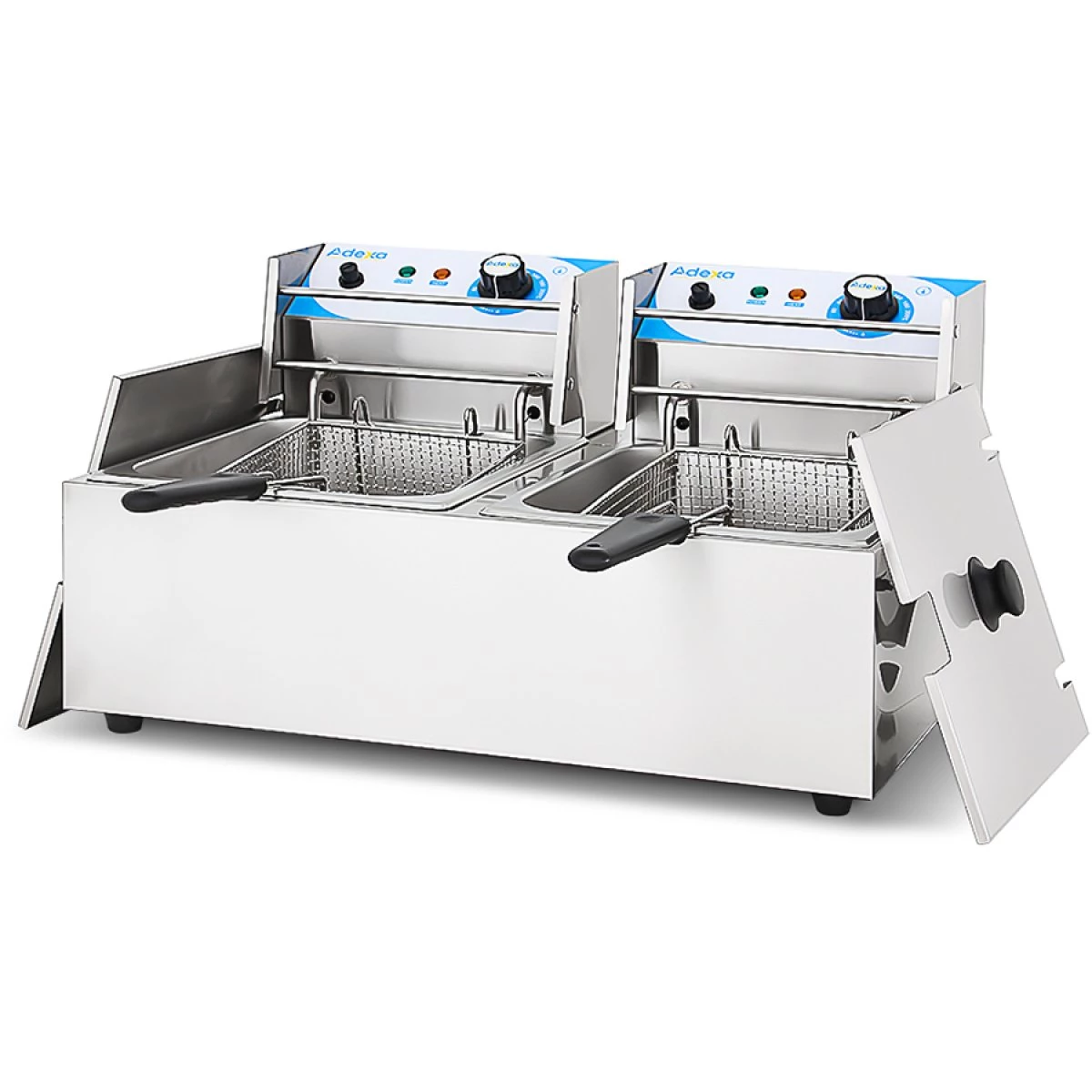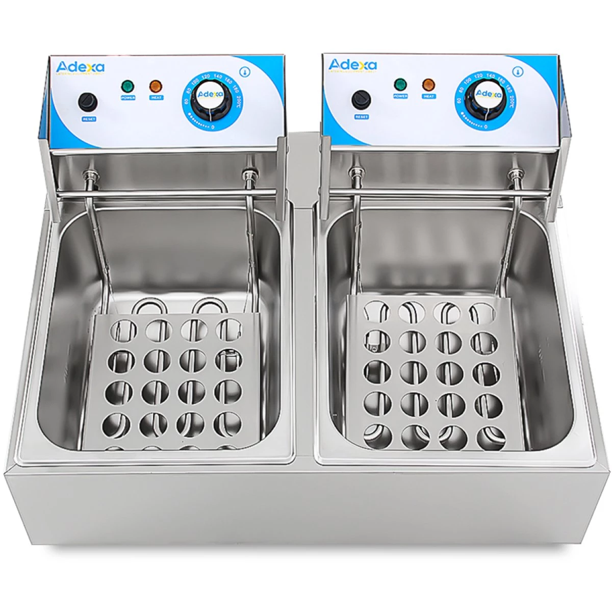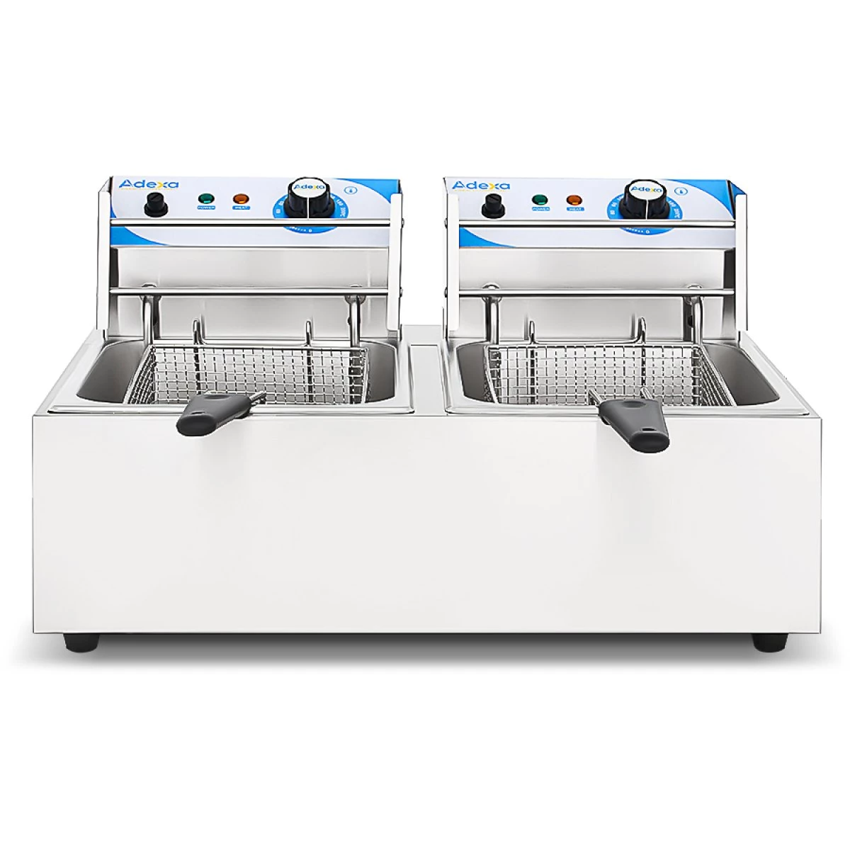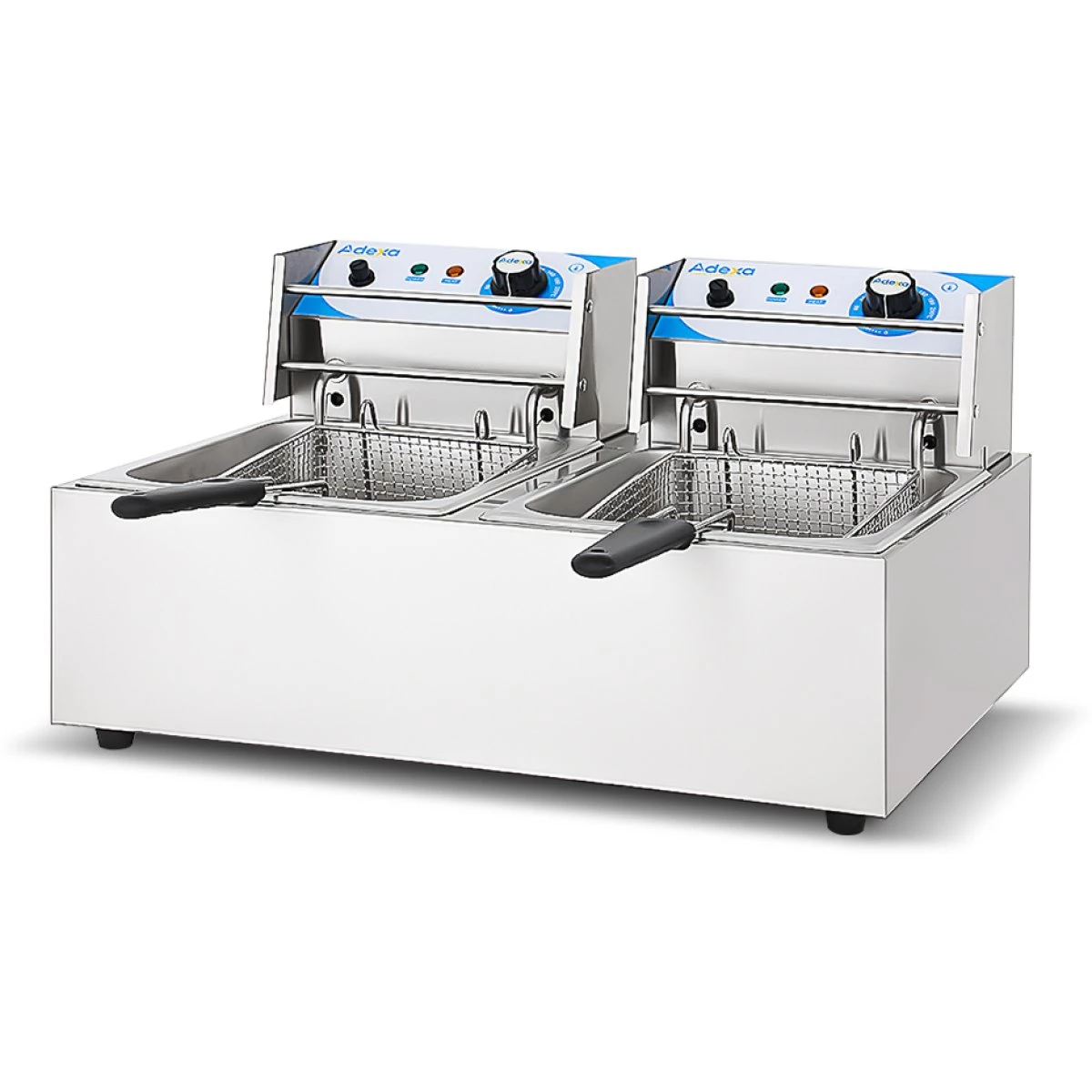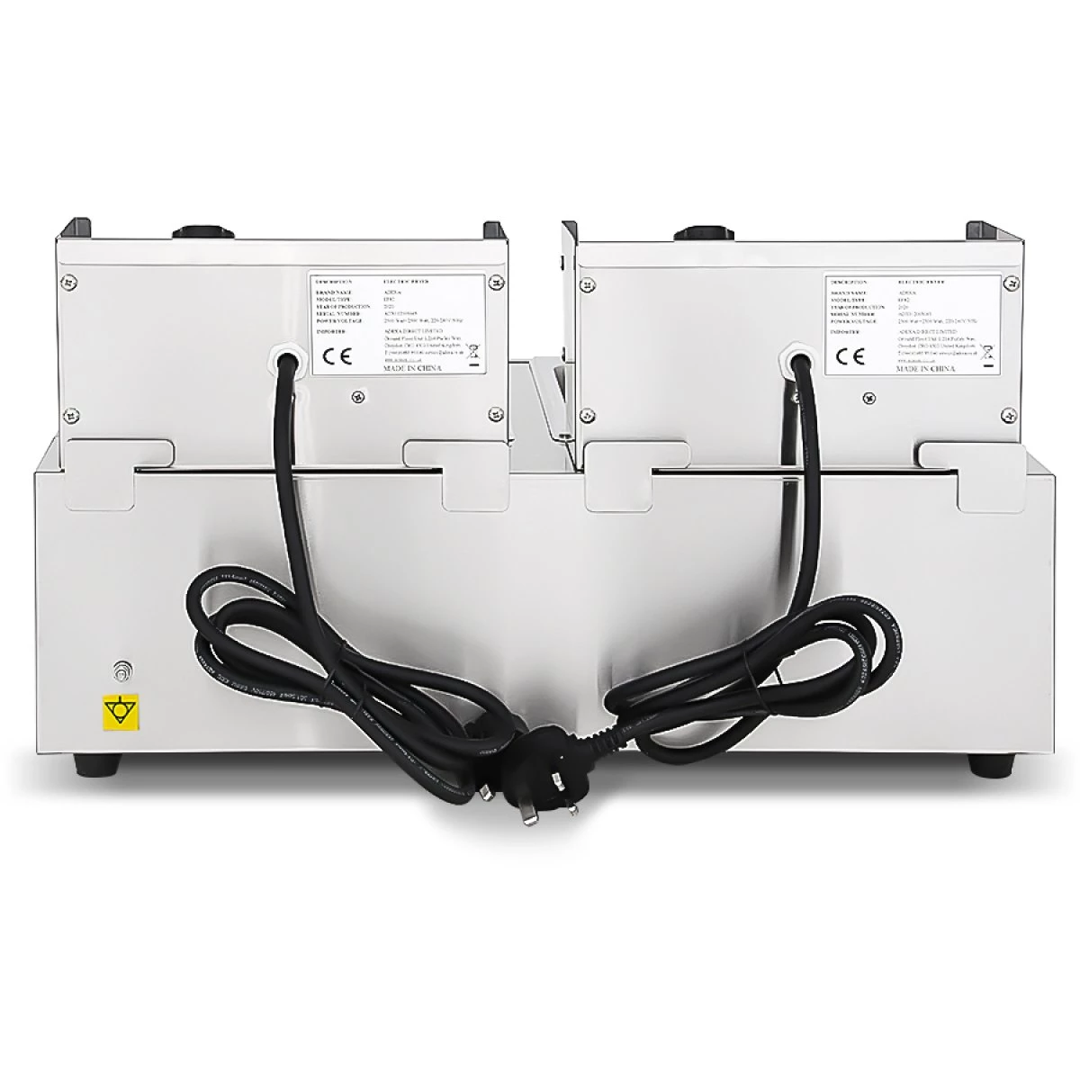 Professional twin tank deep fat fryer at a bargain discount price. A fully stainless steel fryer featuring variable heat control and safety cut-out making the machine safe and ideal for use with a wide variety of foods. Two chambers gives you great versatility, with two different types of food able to be cooked at one time. The stainless steel construction and removable inner pot and control panel allow for easy cleaning.