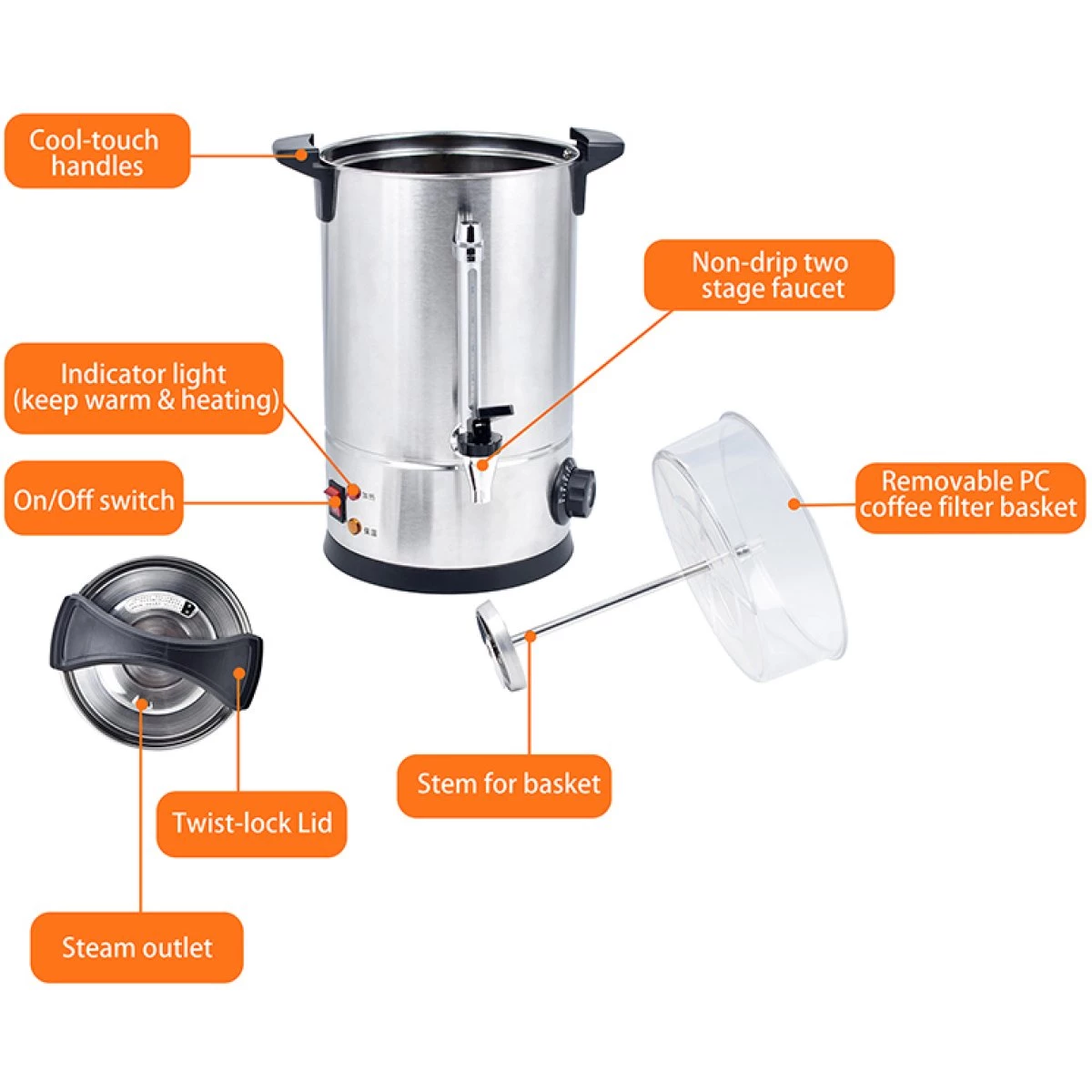 15 litre commercial coffee urn designed for catering customers that need easy access to coffee, whether you are using it for social gatherings, business meetings, club, group function or waiting areas, this urn will definitely meet your expectations.