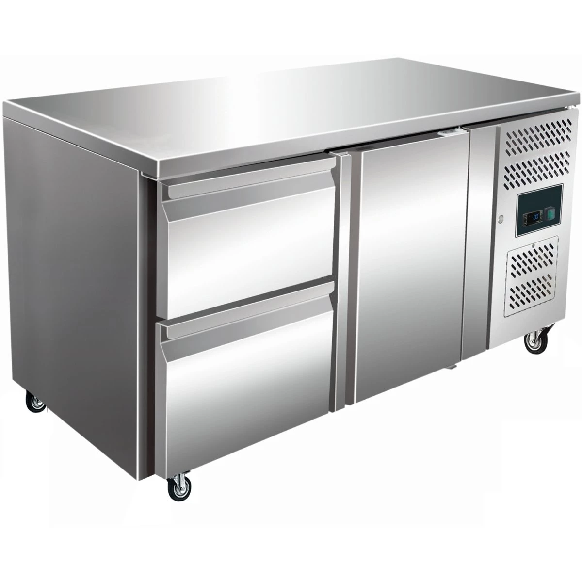 Counter chiller with one stainless steel solid door and two drawers and 4 castors included. This restaurant bench fridge also comes with a range of useful features which are certain to make life in your catering and professional kitchen considerably simpler.