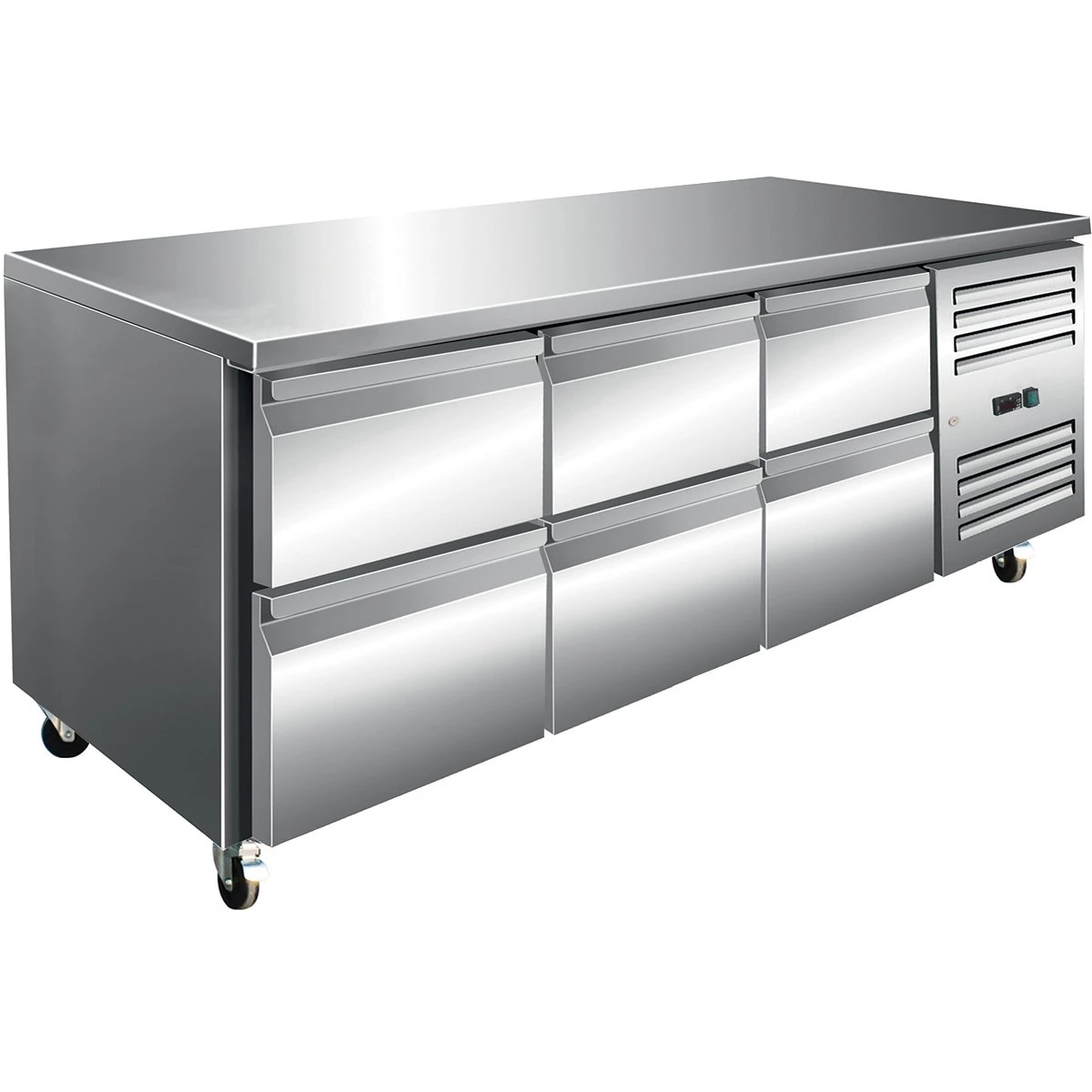 Counter chiller with six GN drawers and 4 castors included. This restaurant bench fridge also comes with a range of useful features which are certain to make life in your catering and professional kitchen considerably simpler.