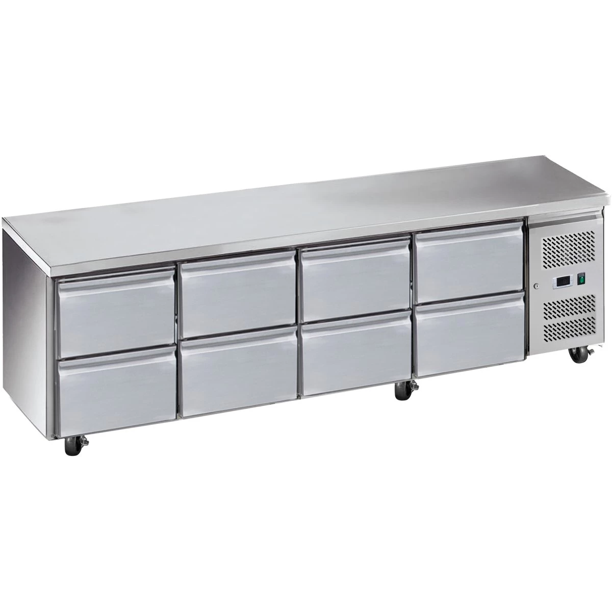 Professional counter chiller with 8 stainless steel solid drawers and 4 castors included. This bench fridge also comes with a range of useful features which are certain to make life in your catering & professional restaurant kitchen considerably simpler.