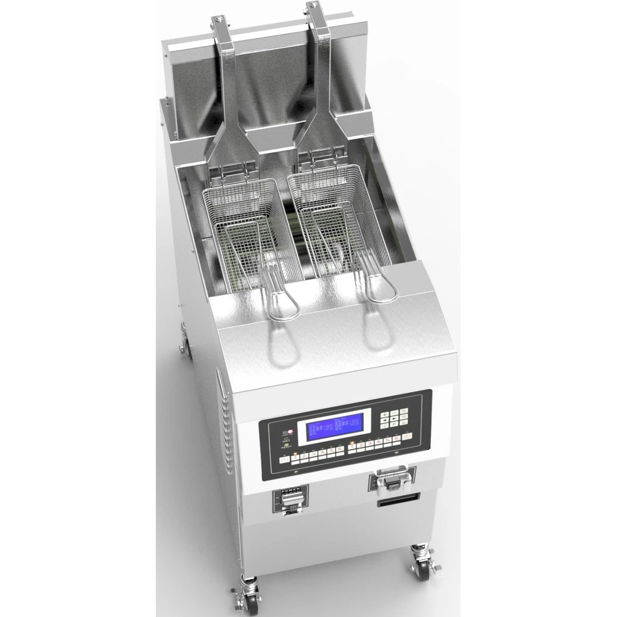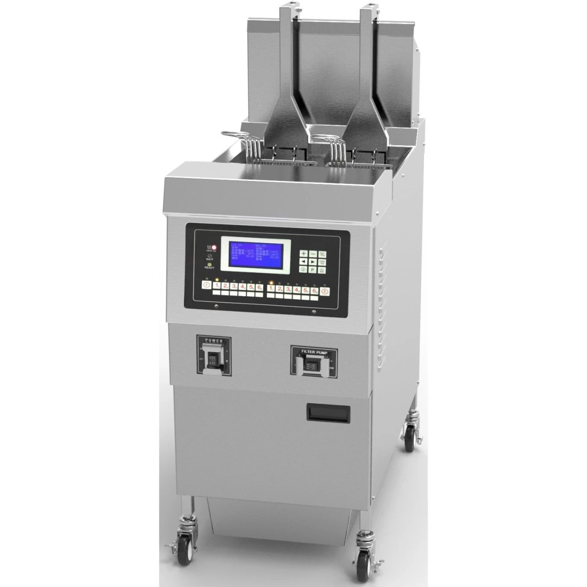 The ideal combination of efficiency and industrial scale volume, this high production electric floor fryer is an excellent addition to any restaurant looking to increase profits from chicken, chips, and other popular fried foods! This fryer features digital controls to let you make almost instant adjustments to your cooking cycles. They also ensure pinpoint accuracy when measuring oil temperature while allowing for high production and fast recovery times. The tank’s bottom slopes forward to help collect and remove sediment from the fry pot, and this unit’s front, sides, and doors are made of stainless steel for long-lasting durability.