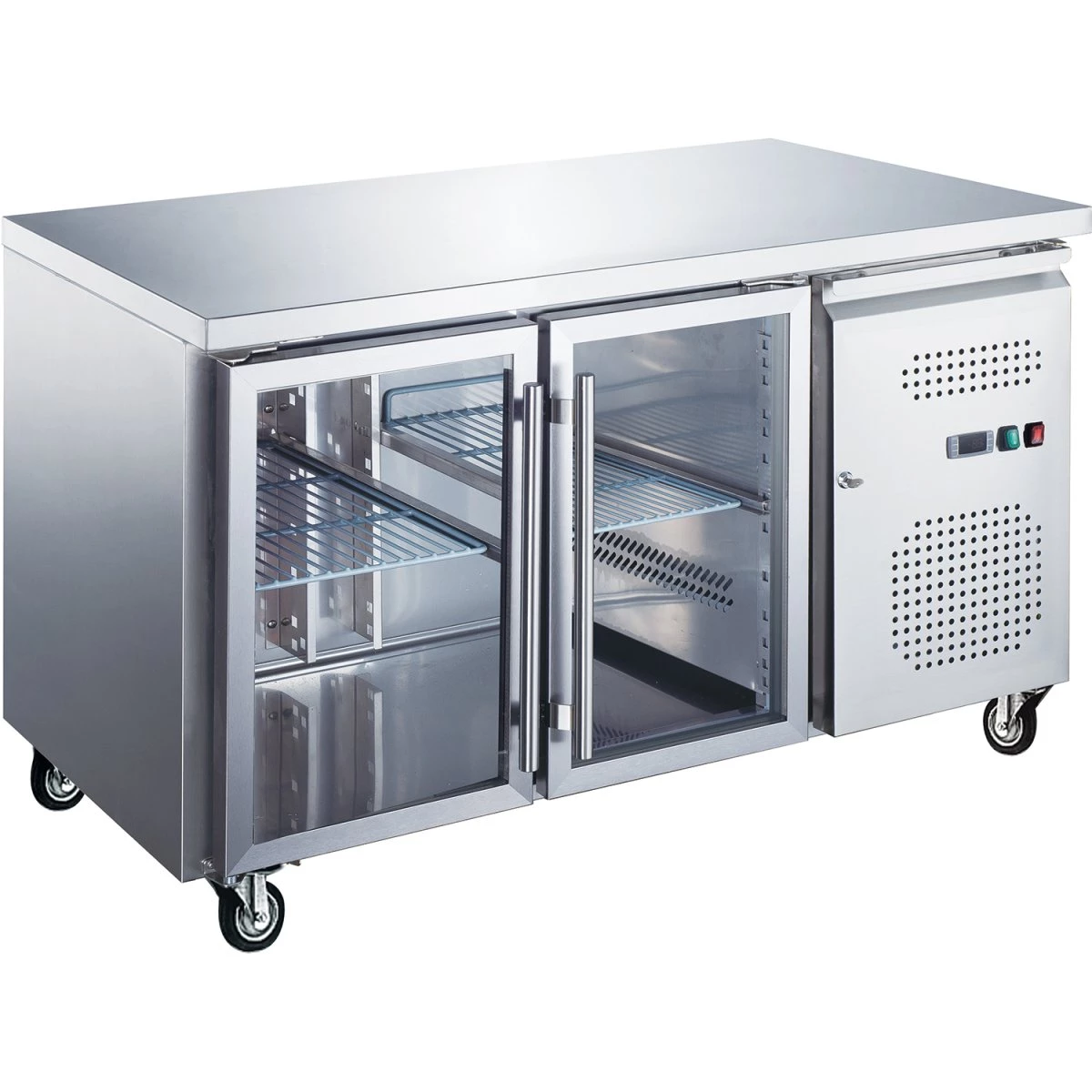 Professional space saving 600mm depth snack counter chiller with two stainless steel solid doors and 4 castors included. Well suited for busy commercial catering businesses.