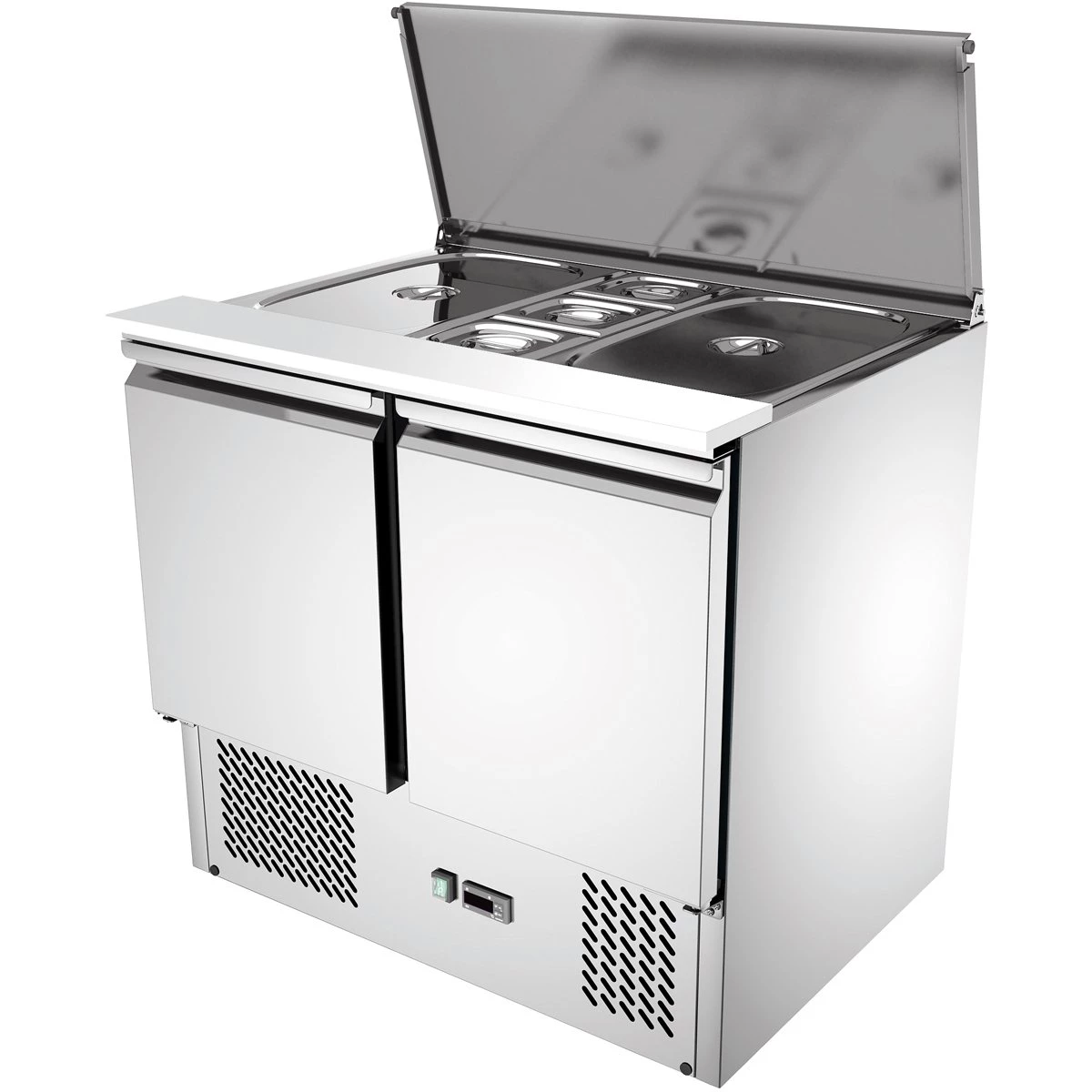 This top quality commercial salad prep counter is designed to give outstanding performance in all busy catering establishments. With 2 doors and 1 shelf per door, this gives great storage and is ideal for restaurants, bakers, butchers, deli shops, sandwich bars, supermarkets. It is built of top quality stainless steel and will give a high level of professional performance, reliability, style and outstanding value for money. Its smooth stainless steel top prep surface allows adequate space for preparing pizzas, sandwiches and salads. The easy clean stainless steel interior provides the perfect environment to keep all your food for preparation.