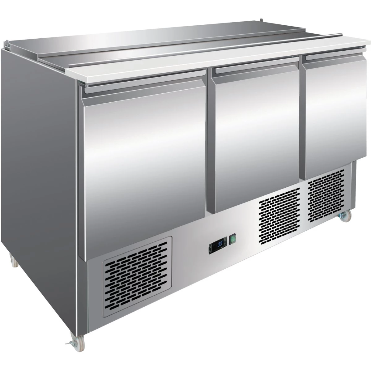 This top quality salad prep counter is designed to give outstanding performance in all busy catering establishments. With 3 doors and 1 shelf per door, this gives great storage and is ideal for restaurants, bakers, butchers, deli shops, sandwich bars, supermarkets. It is built of top quality stainless steel and will give a high level of performance, reliability, style and outstanding value for money. Its smooth stainless steel top prep surface allows adequate space for preparing pizzas, sandwiches and salads. The easy clean stainless steel interior provides the perfect environment to keep all your food for preparation.