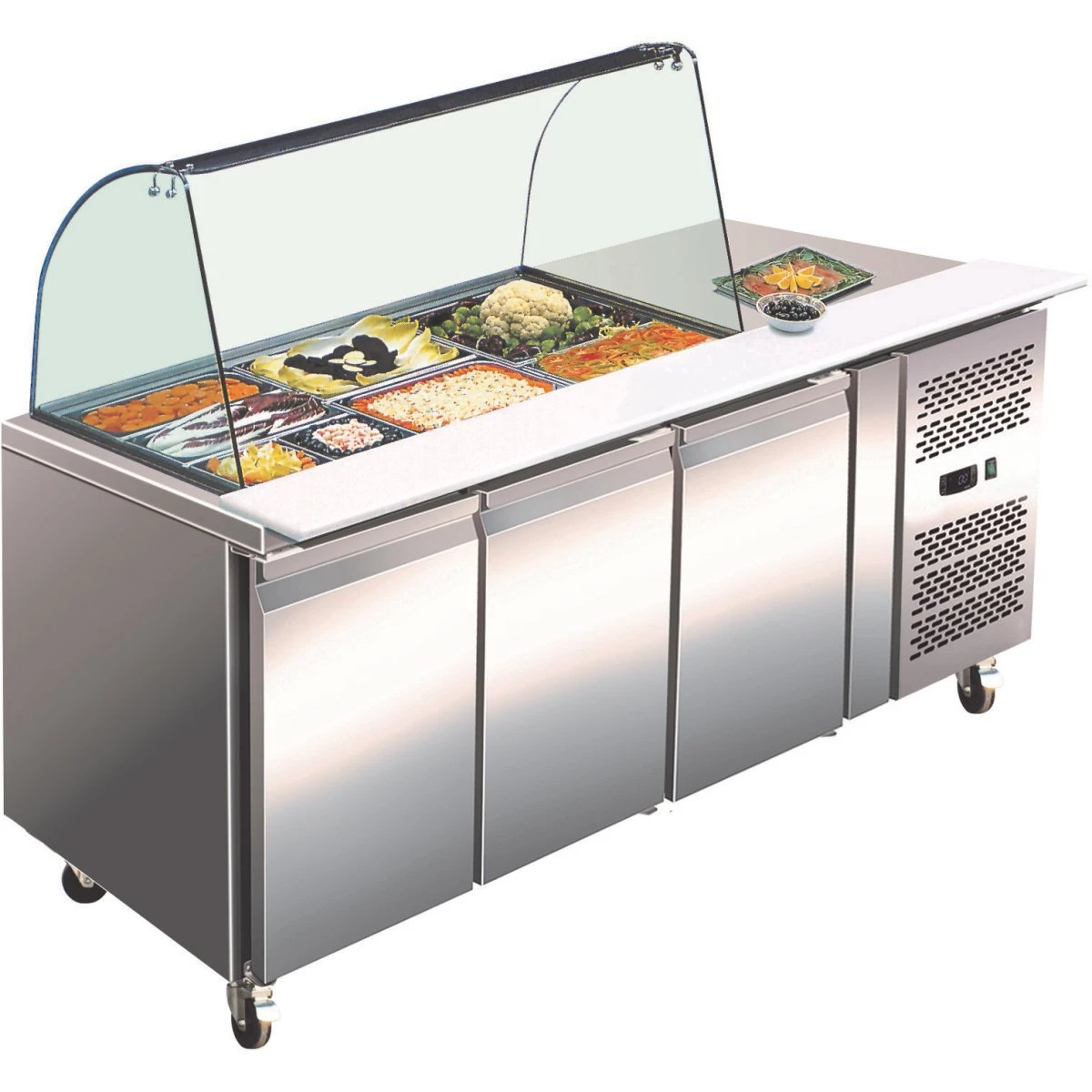 Professional salad chiller with rounded glass top. A perfect addition if you’re prepping pizza, sandwiches, wraps or salads.